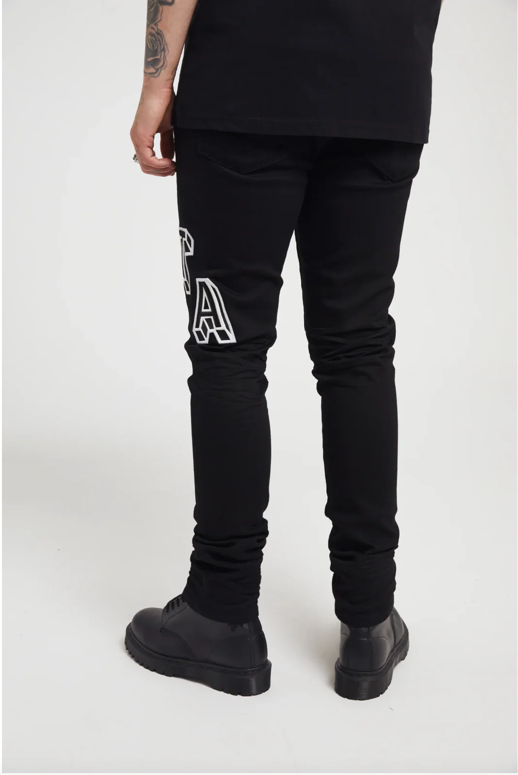 The RTA Bryant Jean in Black Collegiate is made from premium denim with logo patch detailing at side thigh, in our signature RTA skinny fit. This denim style has some stretch, it will be tighter when you first try on and will relax as you wear them in.