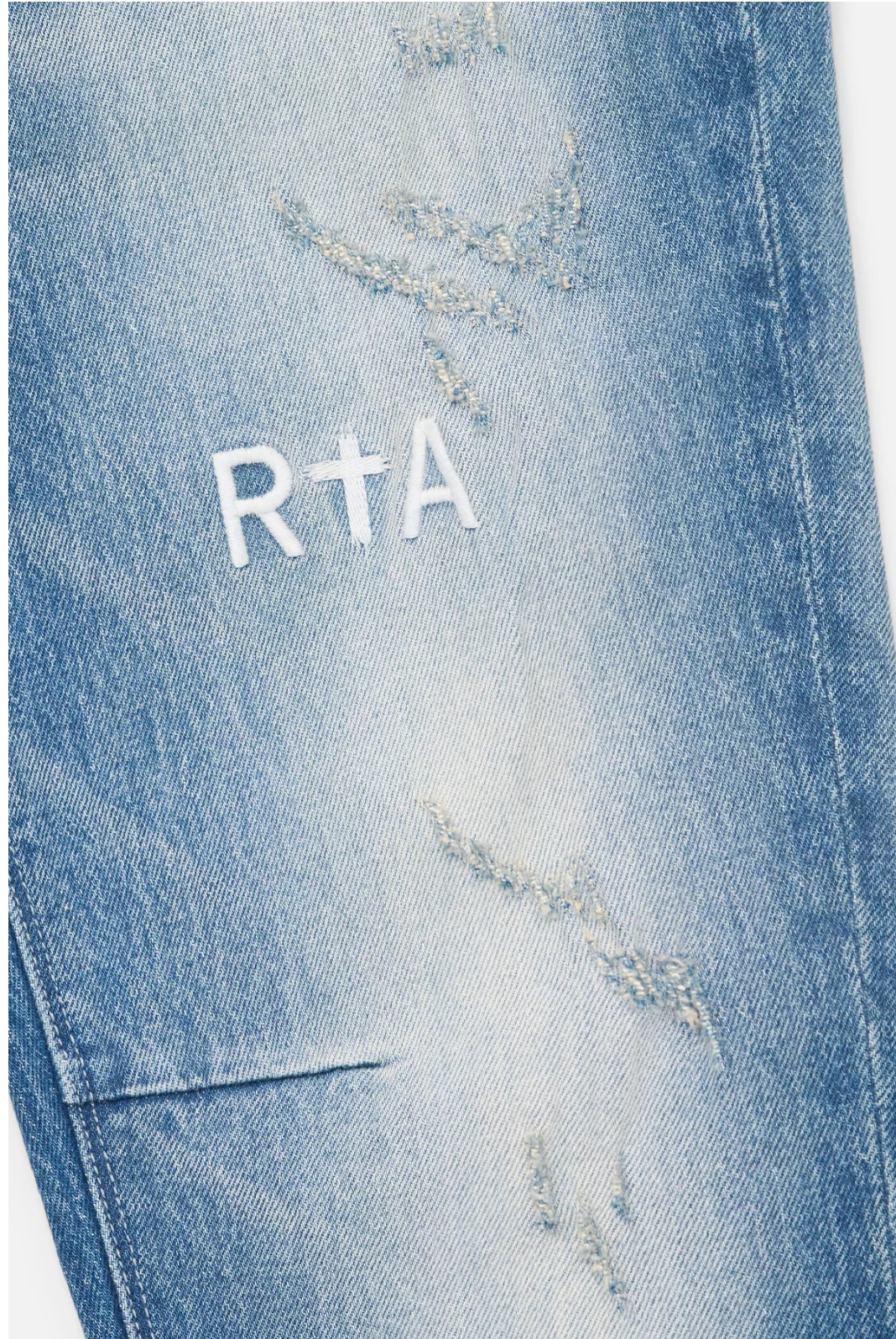 The Bryant Skinny Jean in Light Wash Distressed features a button front, zip fly, belt loops, front scoop pockets, and back patch pockets. Our iconic RTA logo is stitched above the left leg, the classic RTA cross stitched along the back pocket, and finished off with a light wash and distressed detailing.