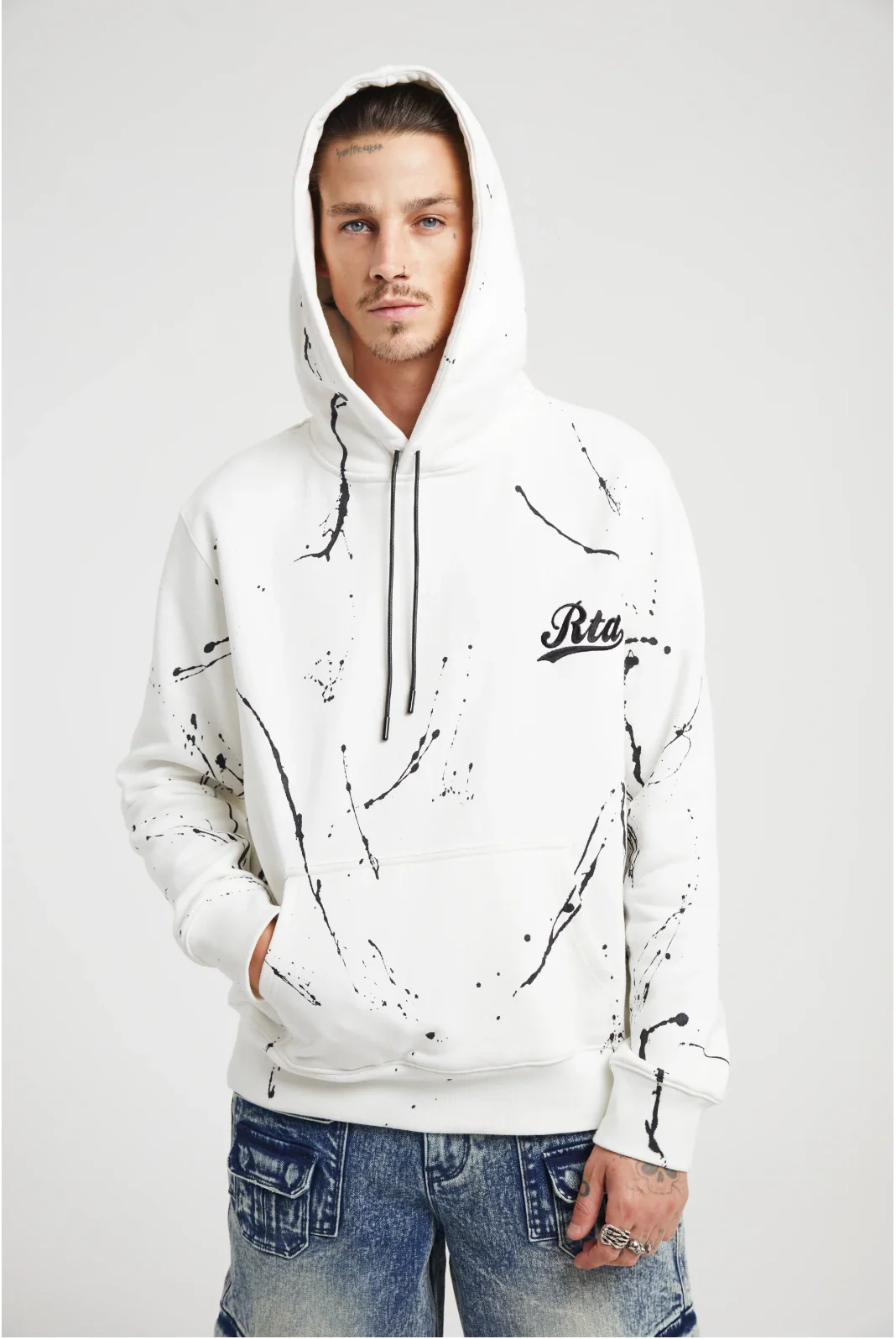 The Dion Hoodie in White Paint Collegiate Script features premium cotton construction with ribbed cuffs and drawstring hood cords. Allover paint splatter graphics and chest logo hit detail this RTA essential style.