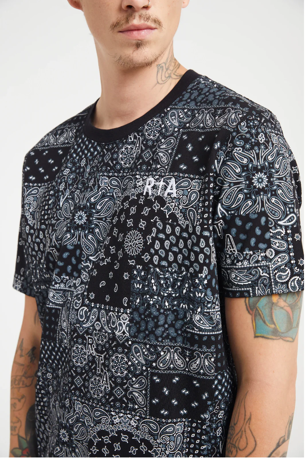 The RTA Liam Tee in Black Bandana is a cotton crewneck t-shirt with contrasting allover paisley print and with logo detailing throughout and logo hit at chest.