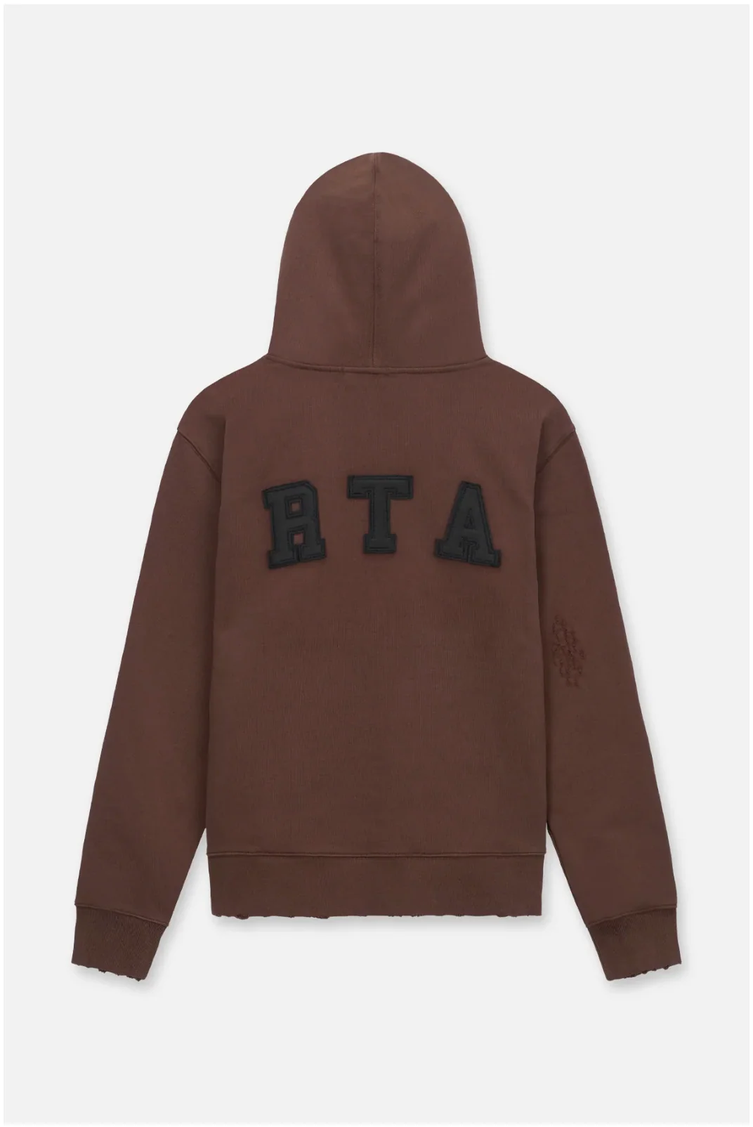 The Markus Hoodie in Brown Collegiate is a classic hoodie featuring distressed details and collegiate inspired RTA logo patch detail at front with long sleeves and front kangaroo pocket.